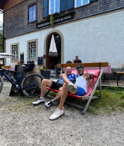 Um pünklich um 12:00 in der Erzherzog Johan Klause im schattigen Garten beim Mittagessen saßen. Frisch gestärkt fuhren wir weiter. Nach dem überqueren der Brandenberge Ache folgte ein 10 minütiges Schiebestück, Hier ging es relativ Eben aber mit kurzen Schiebestücken weiter. Wir beugten uns dem großen Organisator Korbinian und liesen die Bayeralm links von uns liegen. Er lockte uns mit 10km Abfahrt direkt zum Tegernsee und dort gibt es ein Eis. Zwischen Kreuth und Rottach durchquerten wir noch eine Baustelle um auf dem Radweg zu bleiben. Nach dem Eis in Tegernsee hüpften wir noch in den See. Das positive zum Tegernsee: Es gab keine Eisschollen mehr zu sehen.